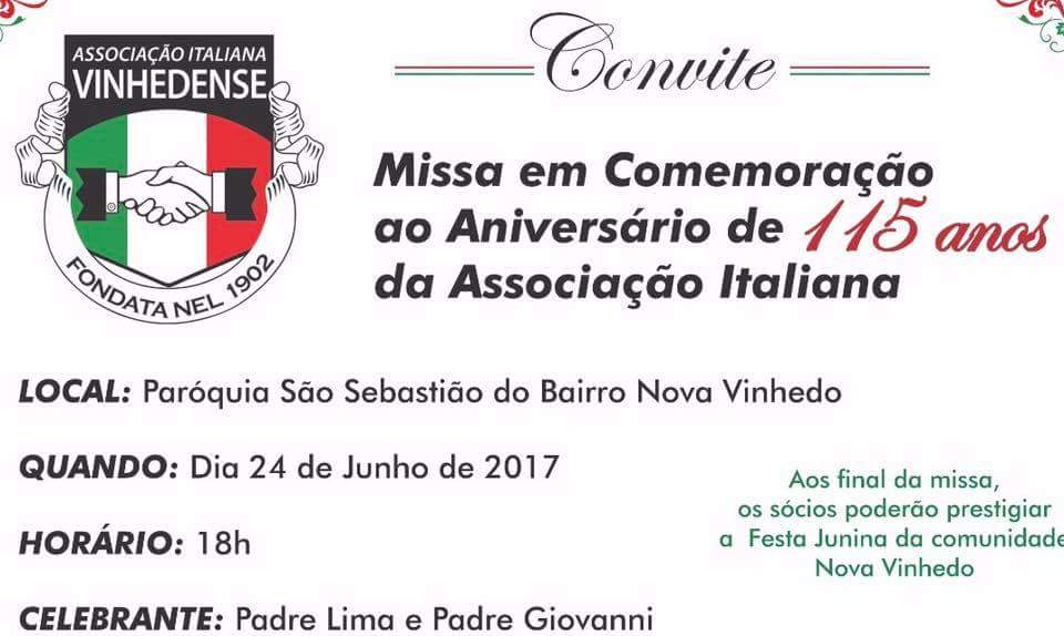 No sábado, dia 24 de junho de 2017, tivemos nossa Missa em Italiano e Festa dos 115 anos de nostra Associação Italiana, com a presença da vice prefeita Neia Serafim (também sócia), do presidente da Câmara, Nil Ramos, dos vereadores Sandro Rebecca e Márcio Melle, além de representantes de entidades como Lions e Rotary Club. Agradecemos a organização de Cida Raimundo e a colaboração dos padres Lima e Giovani, além de todos membros da diretoria desta Associazione. ![]()