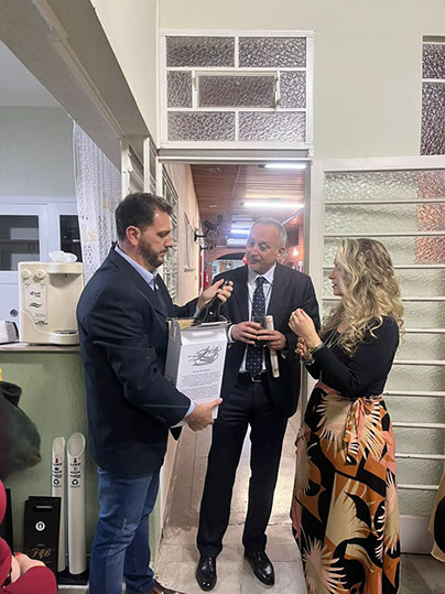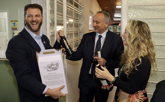 O presidente também reiterou o pedido de trazer o primeiro Posto Avançado do Consulado Italiano no interior, com sede em Vinhedo. Na oportunidade, o agora, ‘amico’ cônsul Domenico foi presenteado com vinhos produzidos em Vinhedo, quatro deles com o selo da Famiglia Baccetti, vinho oficial desta Associazione, e vinhos italianos da Importadora Laretuseo. O presidente entregou ao cônsul, através do Pin representativo, a nomeação imediata de sócio honorário da Associação Italiana Vinhedense, fato inédito em nostra história.