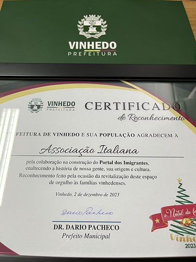 A Associação Italiana Vinhedense (AIVI) foi homenageada pela Prefeitura de Vinhedo, através do prefeito Dr Dario Pacheco, na reinauguração do Portal de Vinhedo, no ultimo sábado (2), símbolo da cidade que as famílias italianas, associadas da AIVI, ajudaram a construir em 1980. Na oportunidade, o presidente Julliano Gasparini, e o associado José Carlos Gasparini, prefeito na época, receberam os certificados.